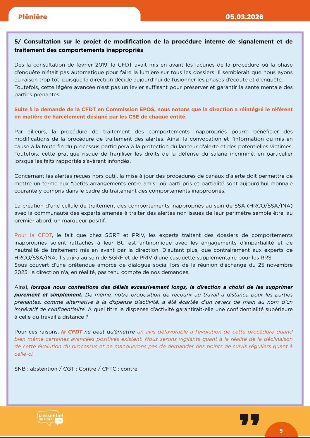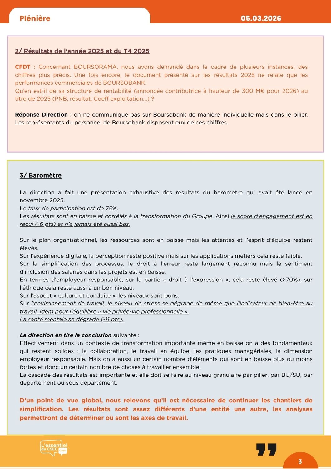 Vos collègues CFDT ont alerté la Direction, qui n’a pas voulu les entendre. Aujourd’hui, le baromètre confirme ce que nous défendons depuis des années. Plus que jamais, la CFDT est le phare dans la tempête pour défendre vos intérêts.