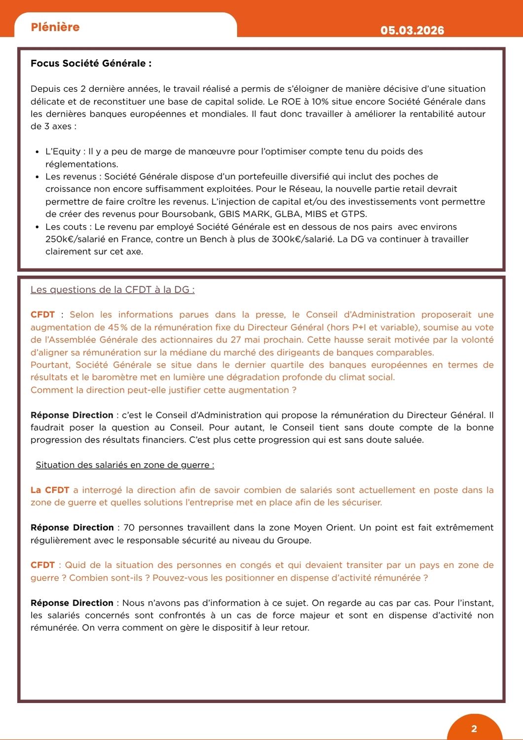 La CFDT s’inquiète de l’autosatisfaction de la Direction Générale face à ces chiffres catastrophiques. D’ailleurs, à la suite de la présentation du Baromètre, S.Krupa a déclaré « nous conduisons une transformation majeure de notre entreprise qui implique des efforts et des changements pour chacun d’entre nous, et allons la poursuivre. » |