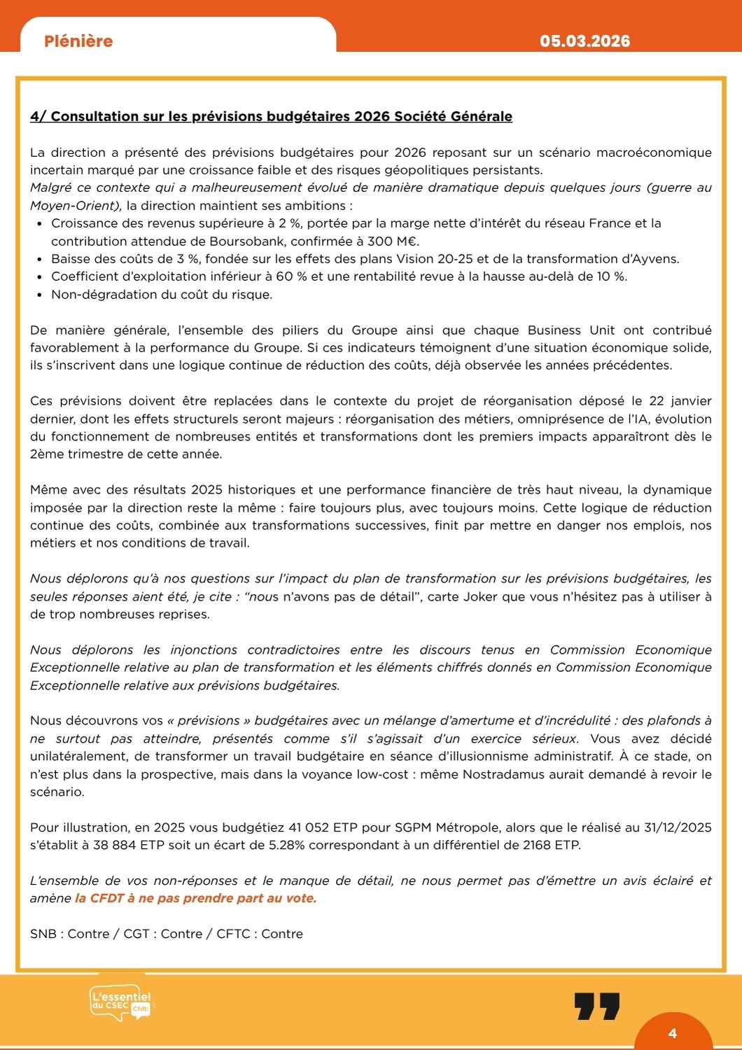 Dans le cadre du projet Vision 2025 et de la refonte du dispositif de rémunération variable des fonctions commerciales du réseau SG, la CFDT reste pleinement vigilante et conteste plusieurs orientations proposées par la Direction.